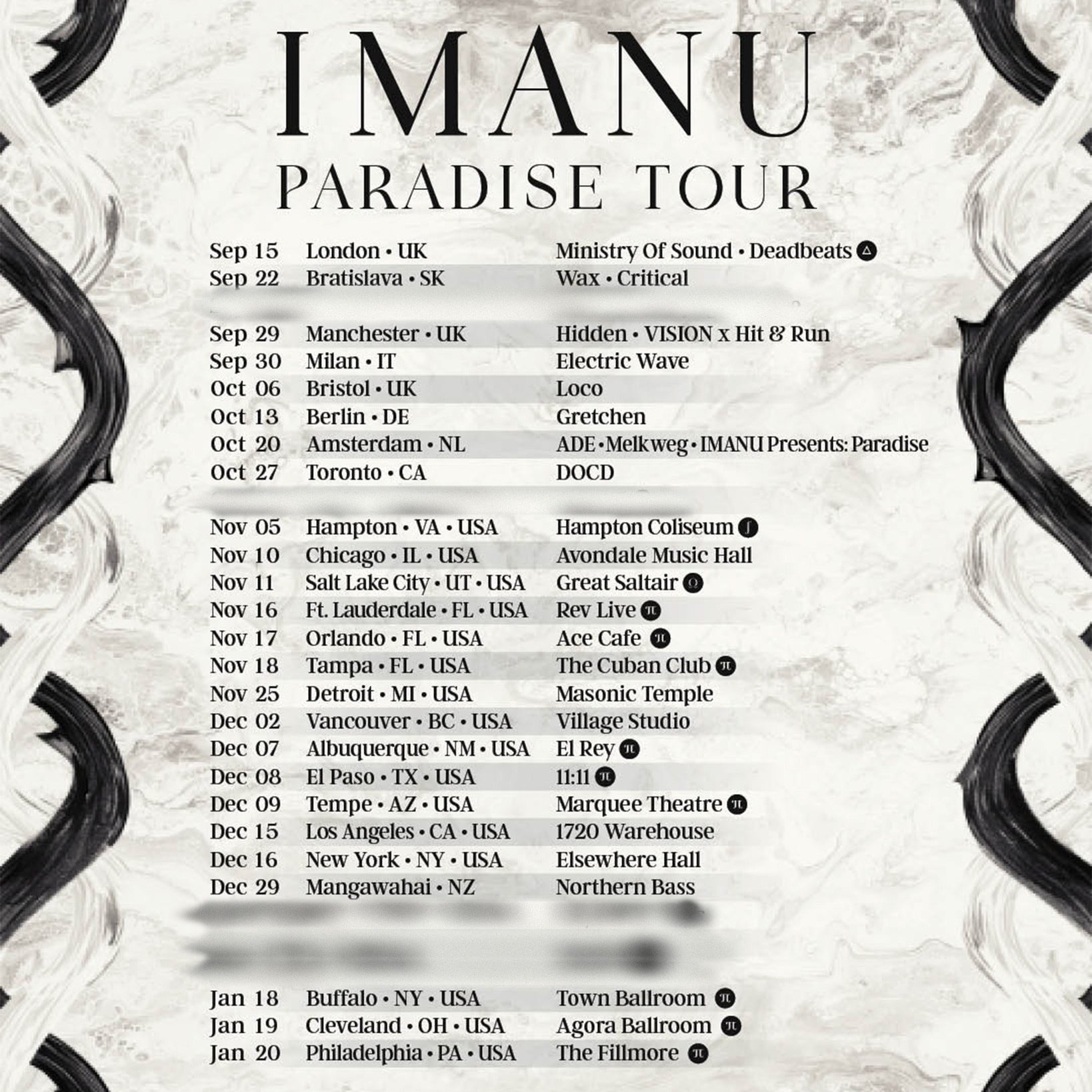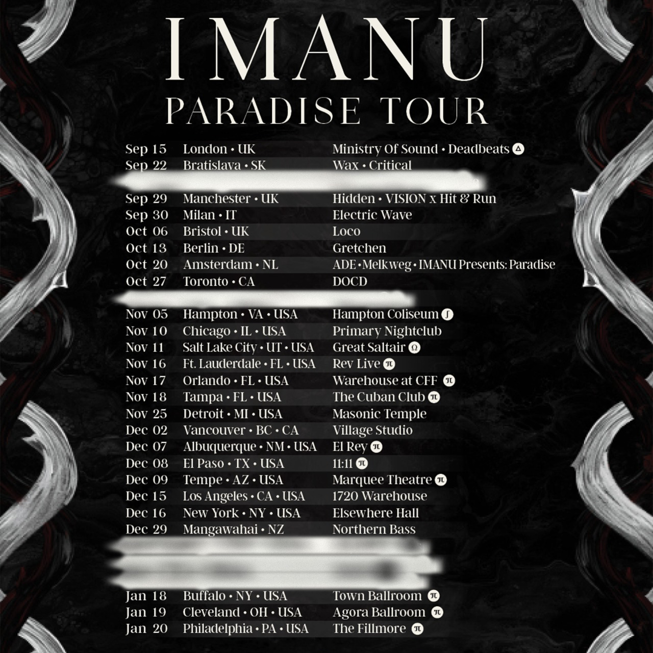 IMANU announces new tour & EP - Paradise. Hitting cities all over the world, IMANU is ready to showcase his first major project since the debut album Unfold. The tour features headline shows in Los Angeles, New York, Amsterdam among other things, a festival run in New Zealand, support dates with artists like SLANDER, G Jones and more!